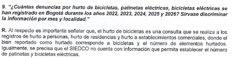 La denuncia surge luego de que la concejal presentara un derecho de petición a la Secretaría de Seguridad, preguntando por las cifras de hurto de bicicletas y patinetas eléctricas en la ciudad. En la respuesta oficial, la entidad confirmó que no cuenta con ese dato debido a que el Sistema de Información Estadístico, Delincuencial, Contravencional y Operativo de la Policía Nacional (SIEDCO) no registra específicamente estos casos.